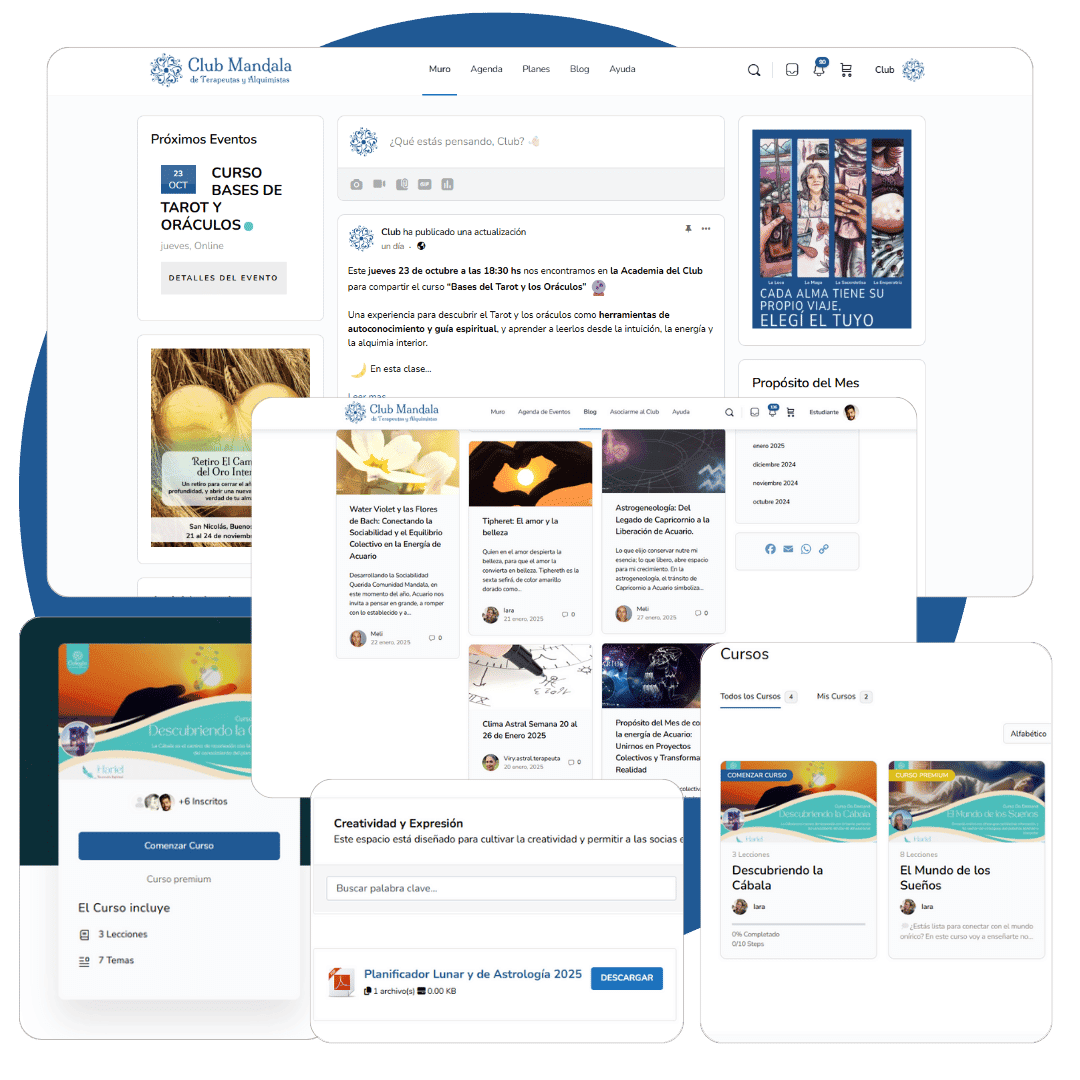 Al registrarte, accedés a los espacios gratuitos del Club Mandala: una ciudad digital pensada para terapeutas, buscadoras y alquimistas del alma.